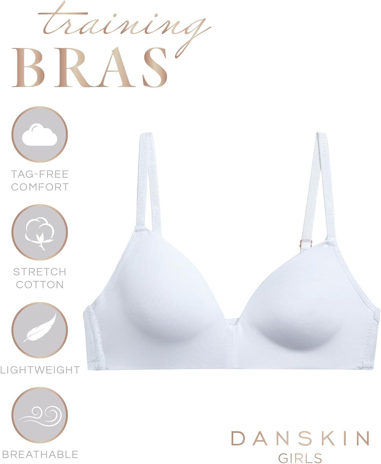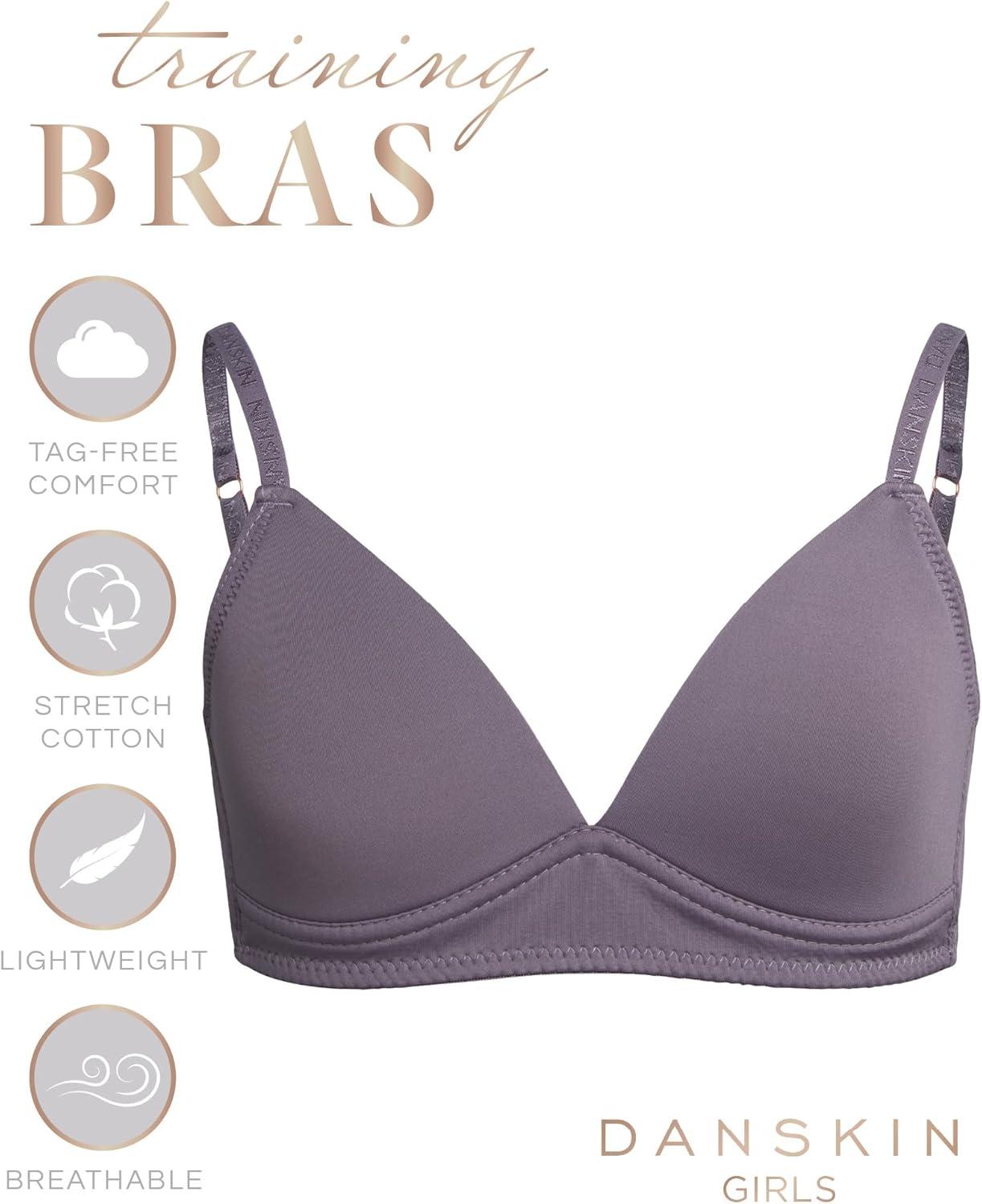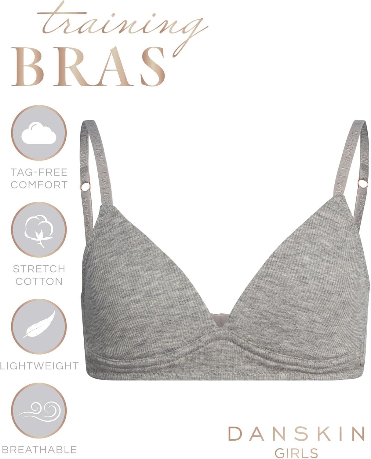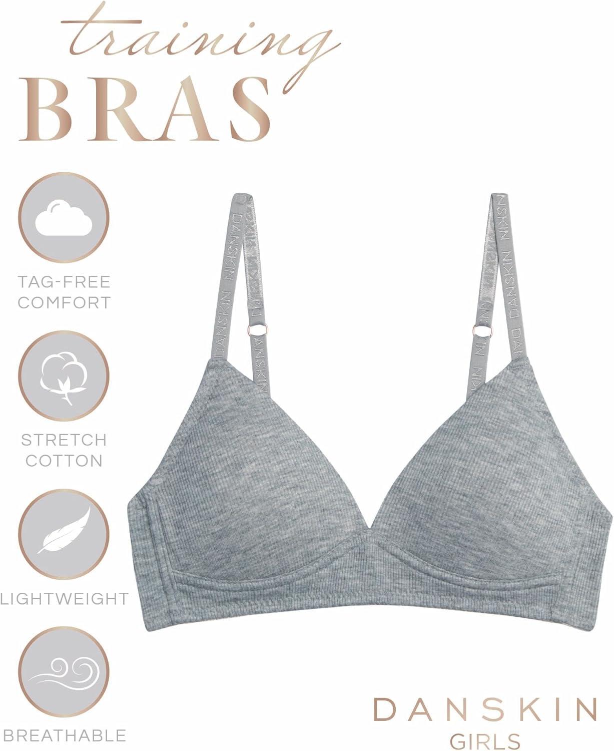 Danskin Girls Training Bra – 3/6 Pack Wirefree Microfiber Molded Cup Bras for Teens with Adjustable Straps (Sizes: 30A-36A)(Light Grey Heather/White/Mulberry- 6pk)